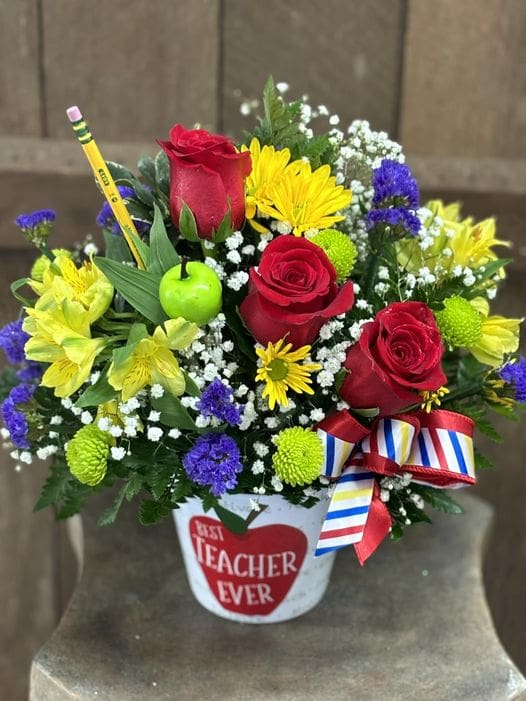 #1 Teacher is designed to appreciate your favorite teacher! Filled with roses, alstroemeria, daisies, and more!
