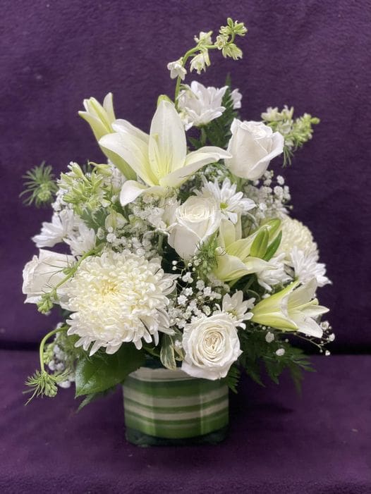 The classic all white arrangement for sympathy featuring lilies, cushions, stock, and other white flowers to offer your condolences. To make this arrangement even more remarkable, choose the PREMIUM size for a small up charge from Deluxe.