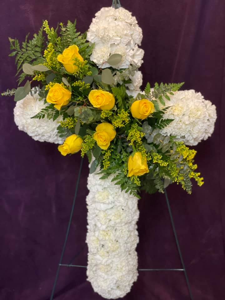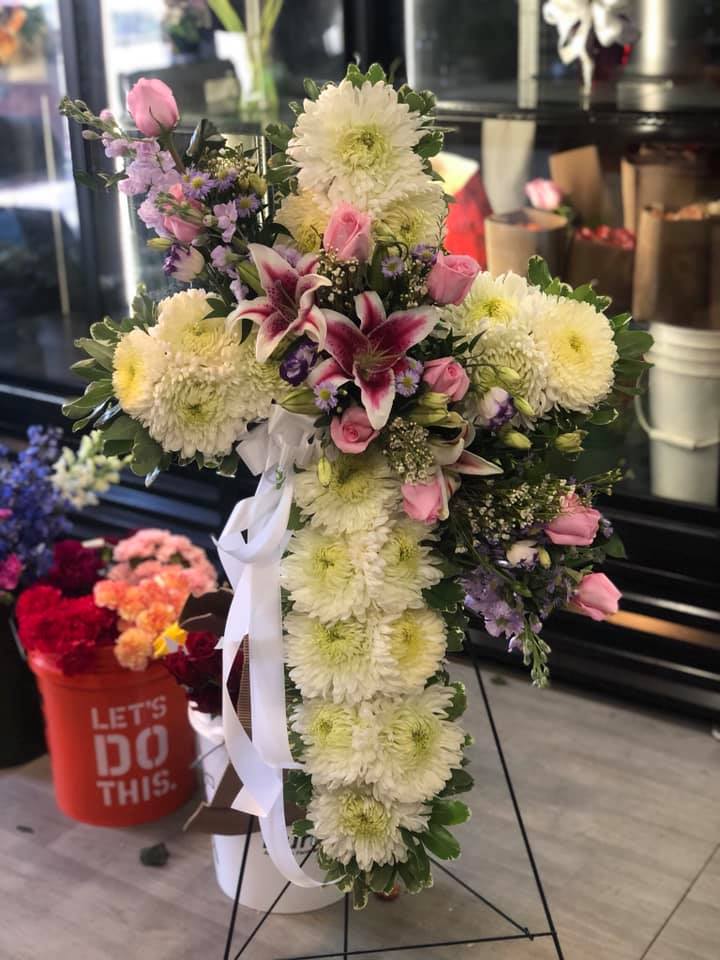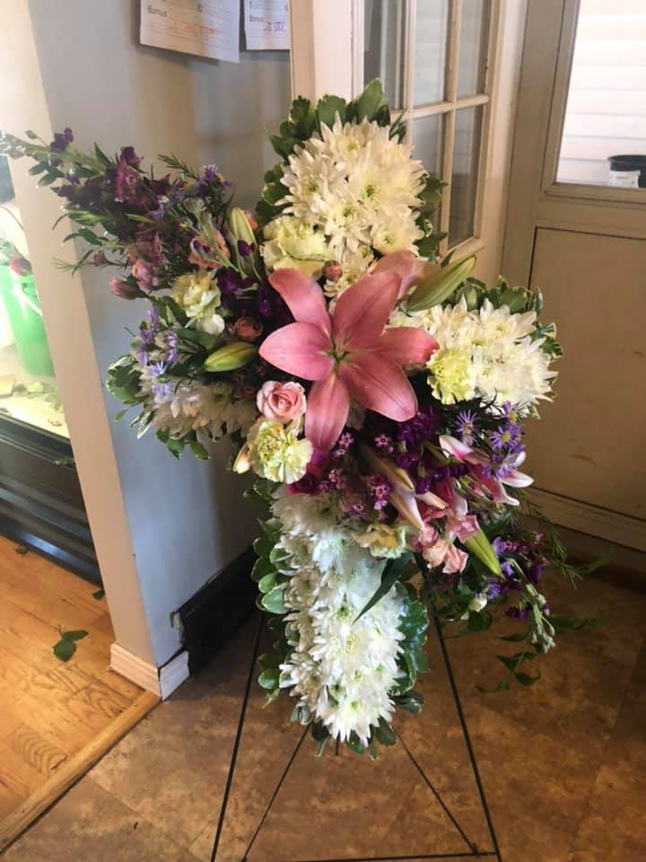 This is a large 24 inch cross arrangement displayed on an easel. We can custom design for you with the specific colors and flowers appropriate for your service. These pictured range between $250-300. Call us to place your specialized order of this piece.