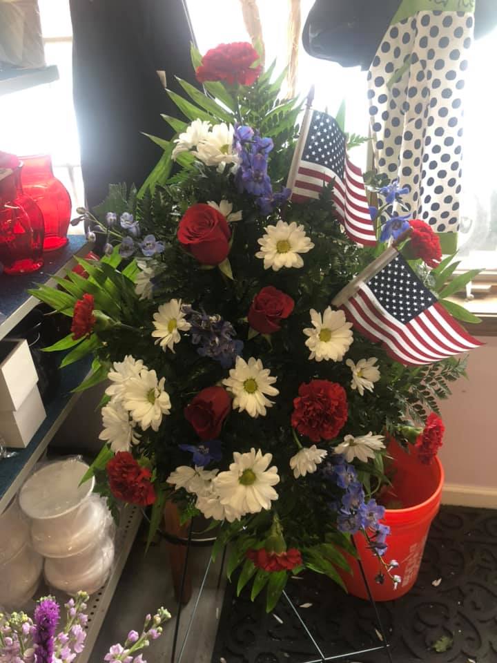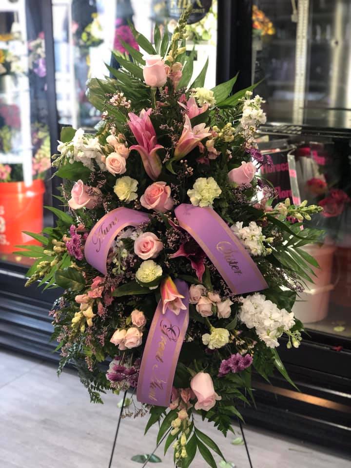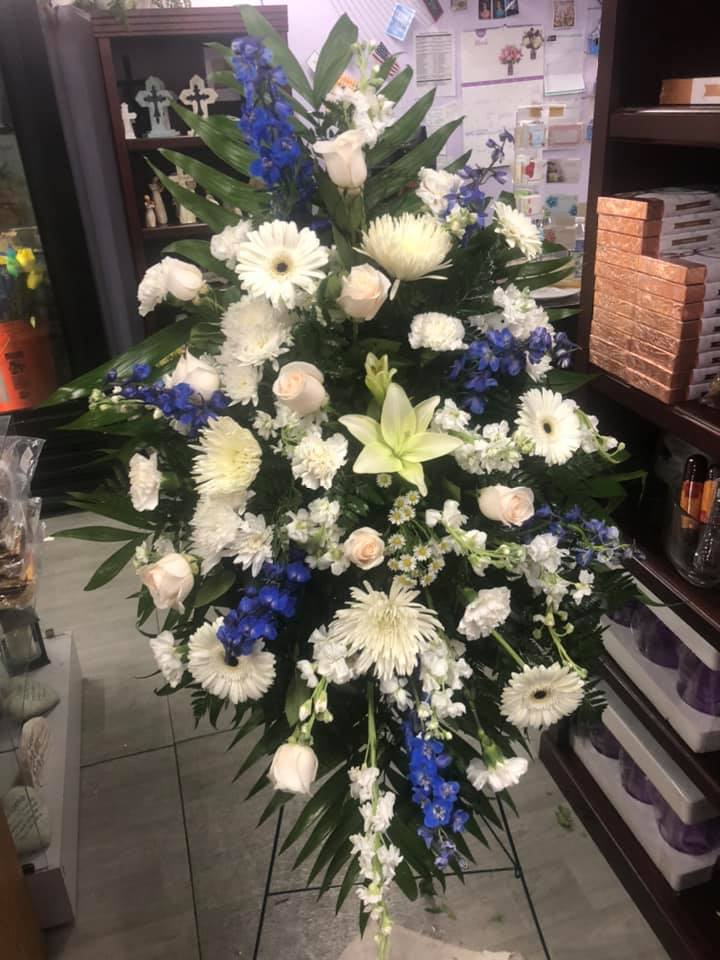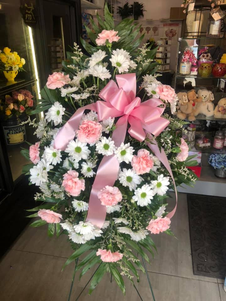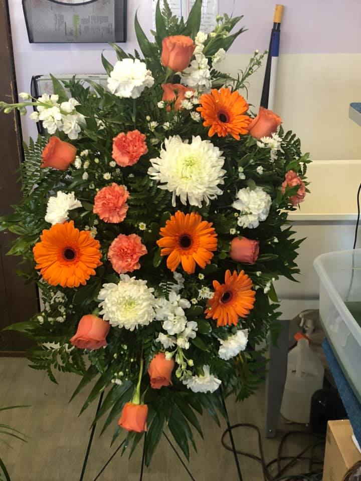 This is a large arrangement displayed on an easel. We can custom design for you with the specific colors and flowers appropriate for your service. Call us to place your specialized order of this piece.