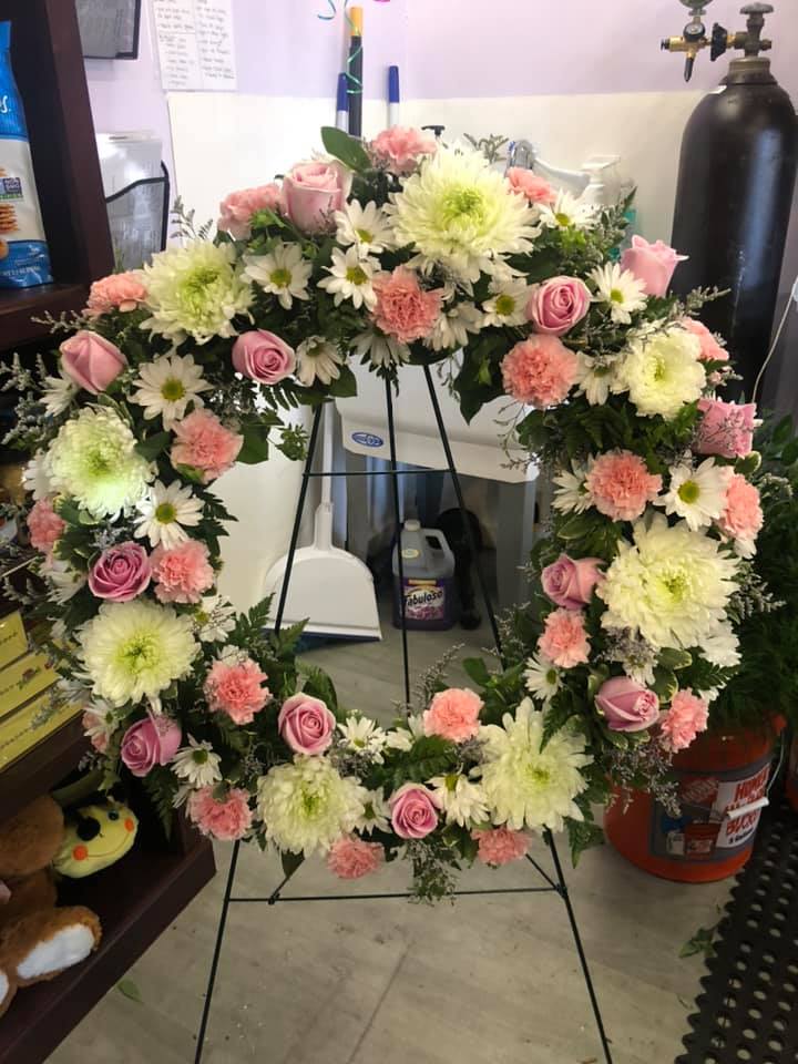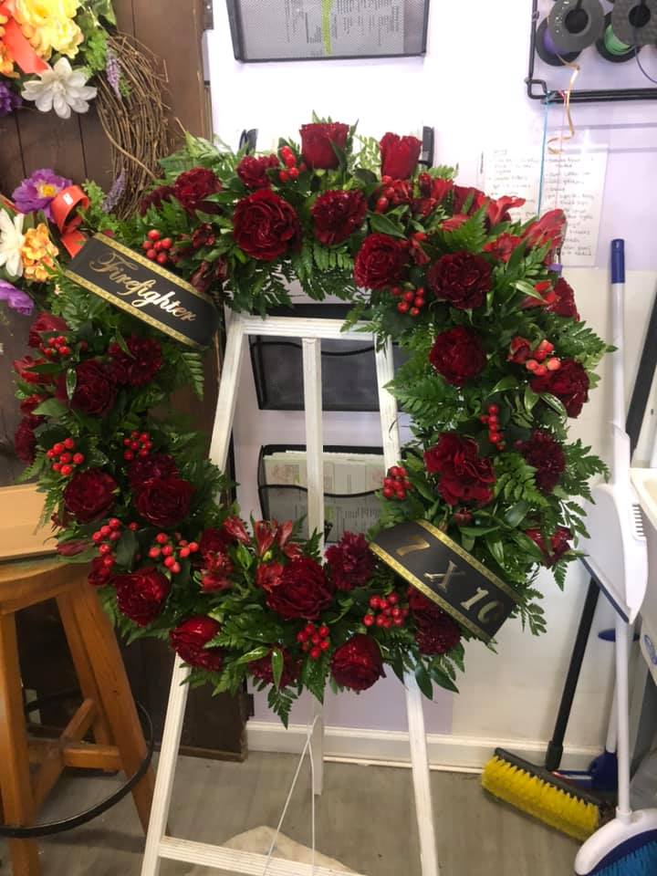 This is a large 18 inch wreath arrangement displayed on an easel. We can custom design for you with the specific colors and flowers appropriate for your service. These pictured range between $250 – $300. Call us to place your specialized order of this piece.